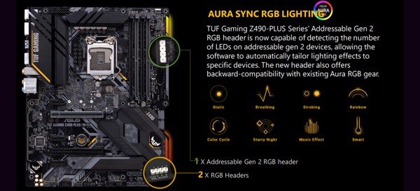 Hệ thống đèn LED sử dụng công nghệ AURA SYNC nổi tiếng, giúp điều khiển dễ dàng các thiết bị tương thích, hoặc điều khiển các thiết bị phụ kiện bổ sung qua cổng 5V DRGB phổ biến.